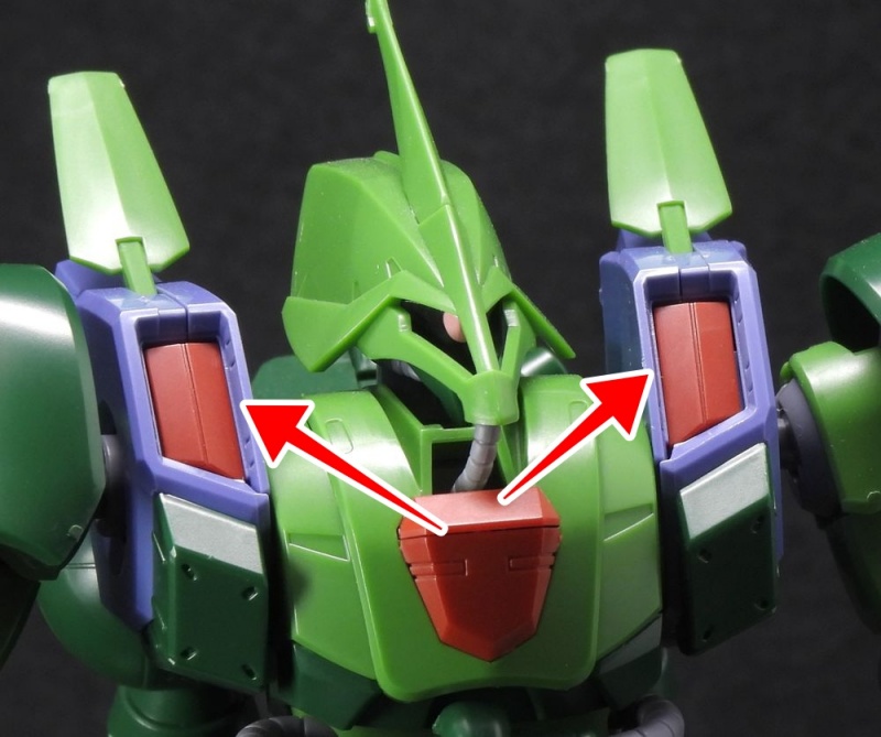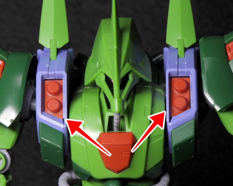 肩部の矢印部分は、パーツの差し替えでミサイル・ポッドを出すことができます。